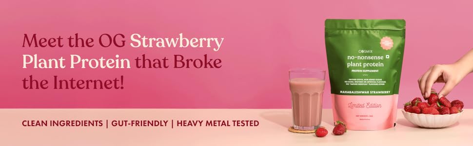 Cosmix No-Nonsense Plant Protein | 23 Protein/Serve | Mahabaleshwar Strawberry | Plant Based Protein, Pea & Rice Isolate | Clean, Easy to Digest | All Essential Amino Acids