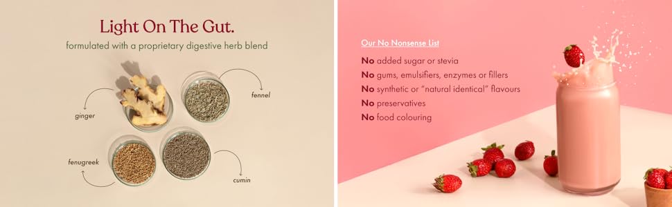 Pea Protein Isolate, Rice Protein Isolate, Coconut Milk Powder, Digestive Herb Blend (Ginger, Fennel, Cumin, Fenugreek), Strawberry, Kerala Vanilla Bean Powder, Monk Fruit. That’s all!