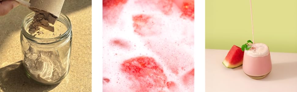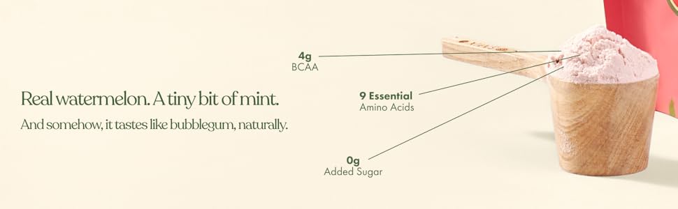 Protein Isolate Blend (Pea and Rice), Vegan Coconut Milk Powder, Watermelon Powder, Digestive Herb Blend (cumin, fennel, fenugreek, ginger), Garden Mint, Vanilla Bean Powder, Monk Fruit. That’s all!